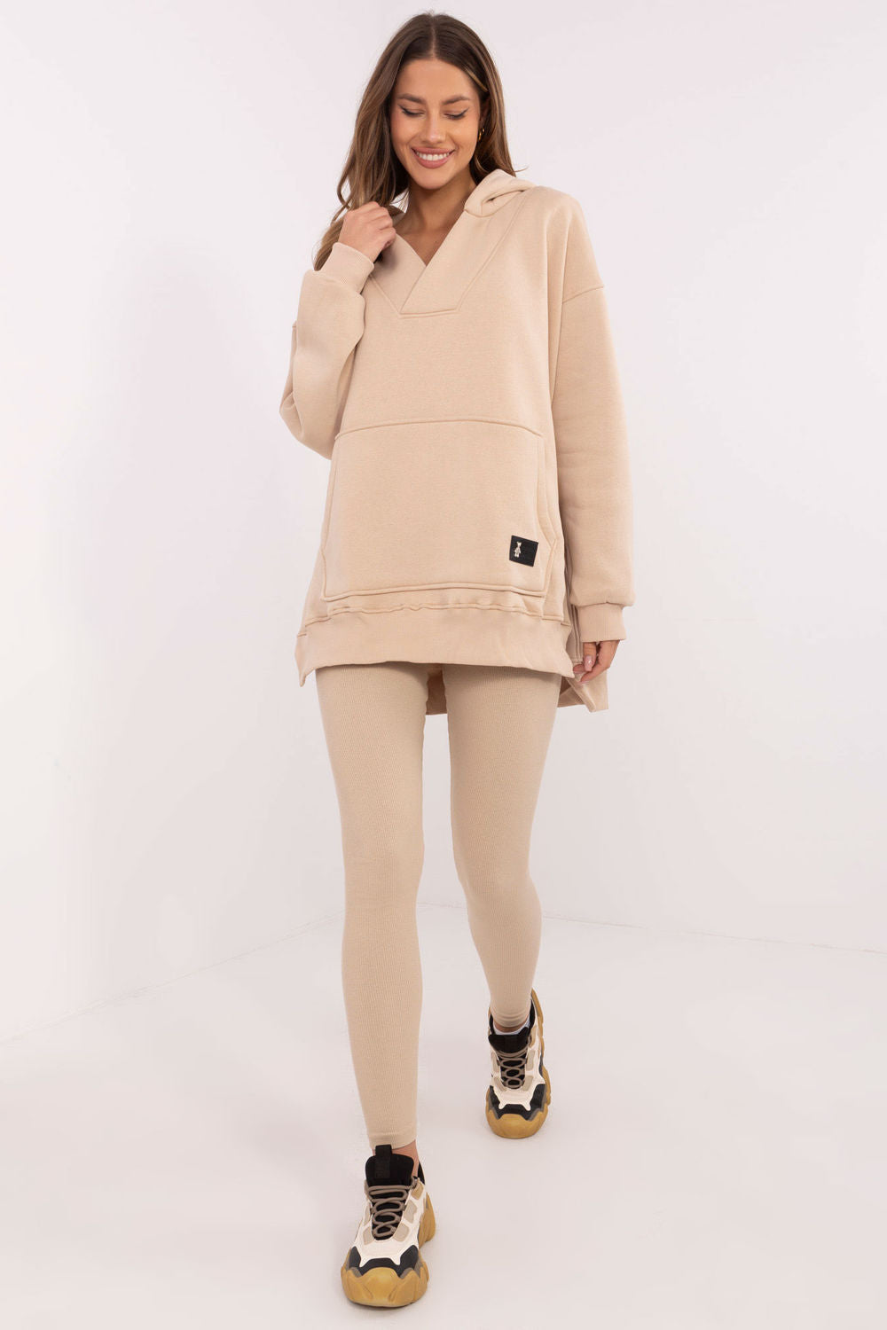 Este conjunto para mujer, compuesto por un top corto, una sudadera larga y leggings, combina comodidad y estilo, ideal tanto para el día a día como para el deporte. Con un estilo casual y deportivo, es perfecto para pasear, entrenar o relajarse en casa. La sudadera alargada es una prenda práctica y moderna. Confeccionada en una cálida mezcla de algodón y poliéster, proporciona calidez y comodidad en los días más fríos. Con una amplia capucha, mangas largas y un bolsillo tipo canguro, es funcional y elegante. El escote en V le da un toque original, y el parche delantero le aporta personalidad. El top, con su clásico cuello redondo, está confeccionado en algodón con un toque de elastano, lo que garantiza comodidad y un ajuste perfecto. El corte más corto realza la silueta, combinando a la perfección con la cintura alta de los leggings. Los leggings con perneras estrechas y cintura alta garantizan comodidad y libertad de movimiento. Su tejido elástico, de algodón con elastano añadido, se adapta perfectamente al cuerpo. La estructura acanalada del material les confiere un estilo único, realzando el estilo moderno del conjunto. El patrón suave crea un conjunto coherente y moderno, perfecto para mujeres activas que valoran la comodidad y el diseño a la moda.