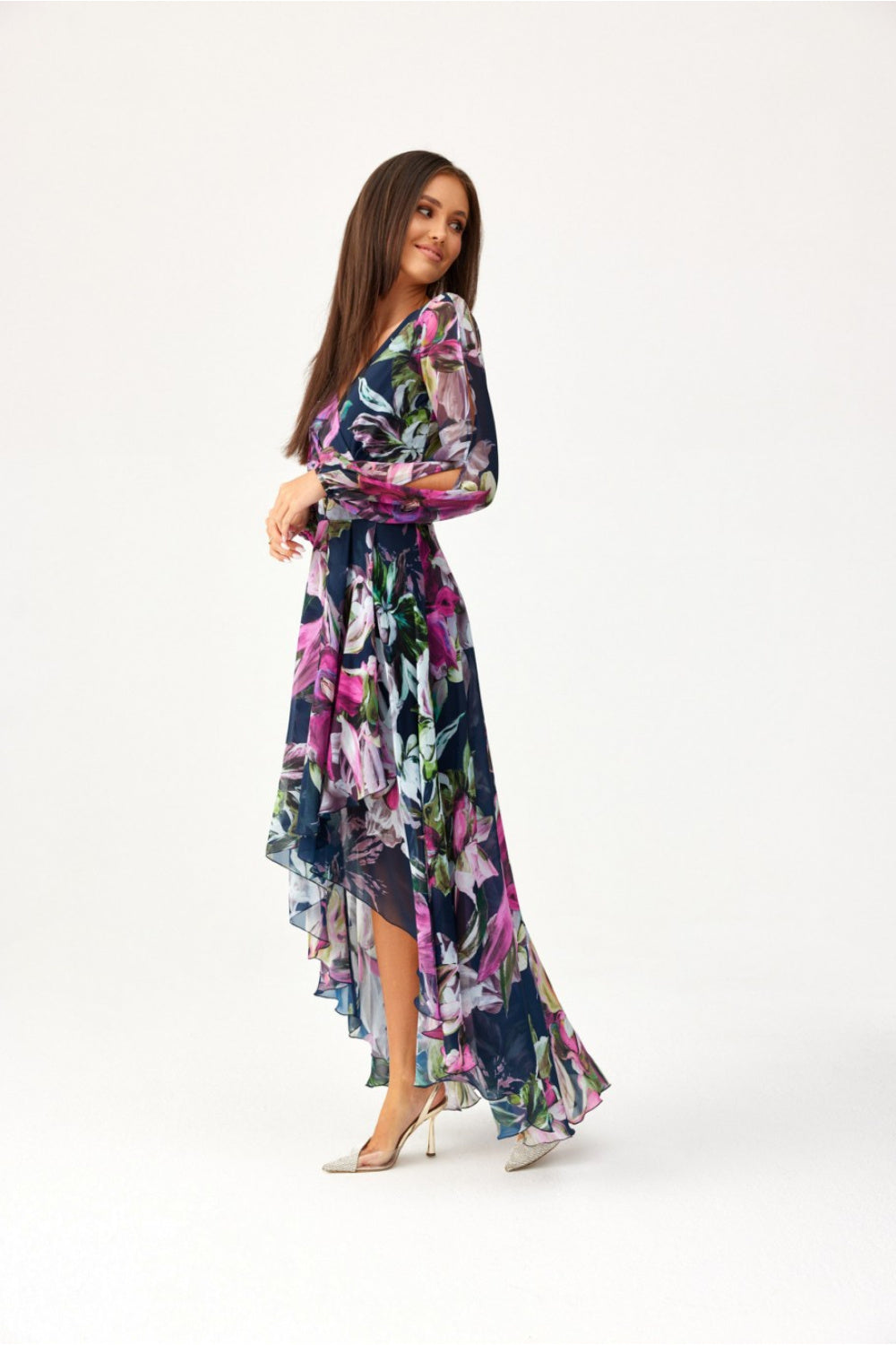 Vestido maxi asimétrico. Bajo acampanado, top con escote cruzado y espectaculares mangas largas abullonadas con aberturas decorativas. Mangas rematadas con banda elástica. El vestido, ajustado en la cintura, realzará a la perfección la cintura. Se cierra con cremallera en la espalda, dejando una delicada abertura. El vestido tiene una combinación cosida, por lo que la tela no se transparenta. Simplemente añade delicadas joyas y deslumbrarás a todos. El corte y el largo son perfectos para cualquier figura, aportando ligereza a la silueta y añadiendo unos centímetros de longitud. El tejido fluido y delicado ondulará suavemente con cada movimiento, dejando una impresión inolvidable. El producto se fabrica y cose en Polonia.