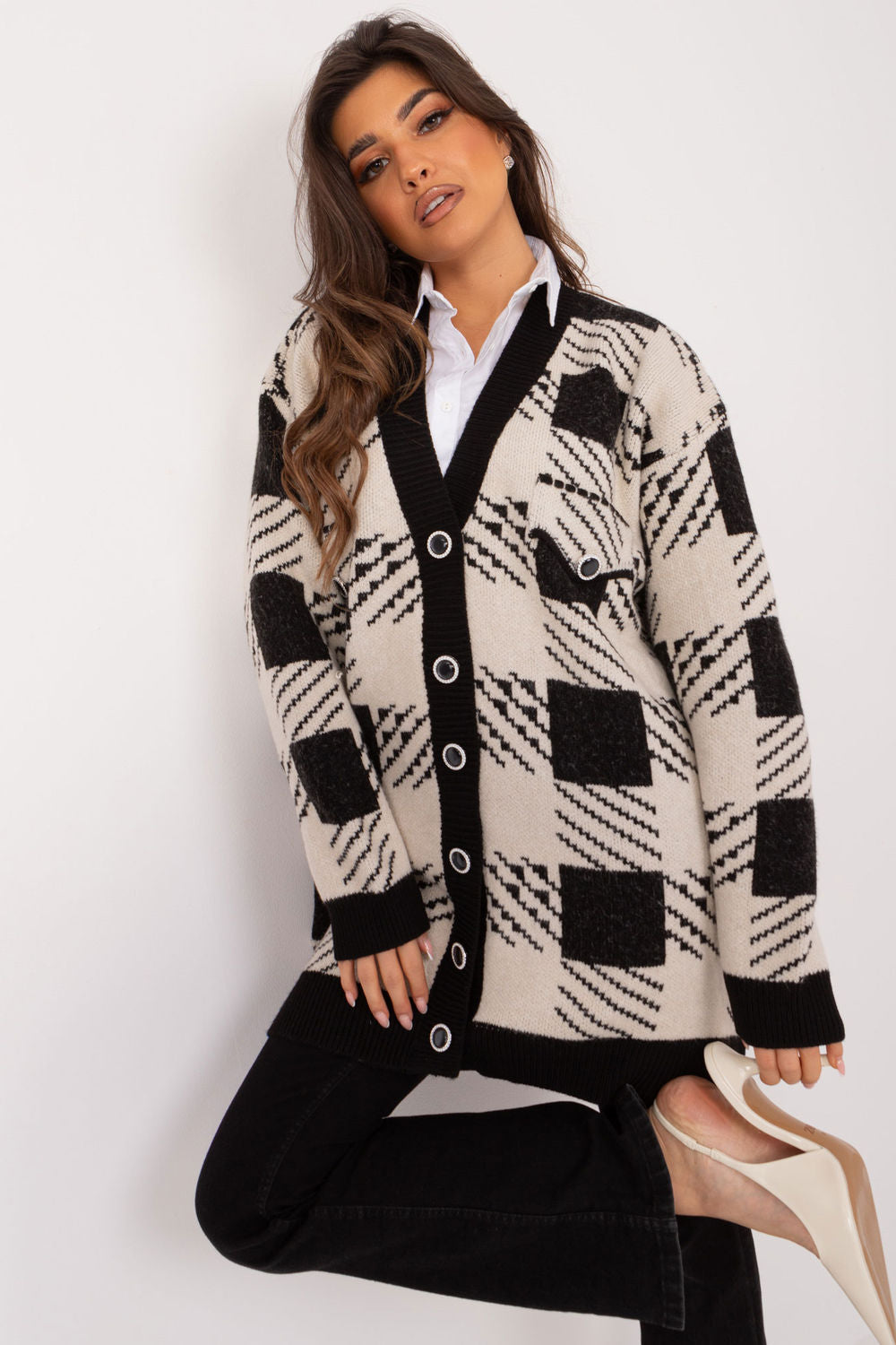 Un suéter informal largo para mujer es la elección perfecta para el uso diario y el trabajo. Fabricado con una mezcla de acrílico, poliéster y elastano, es suave, elástico y cómodo de llevar. El escote en pico aporta elegancia, mientras que el cierre con botones aporta un toque clásico. El patrón geométrico realza el estilo moderno y convierte el jersey en una pieza única de armario. Las mangas largas y el corte más holgado brindan comodidad y libertad de movimiento. Perfecto para jeans, faldas o pantalones de vestir, ideal para estilos casuales y de oficina.