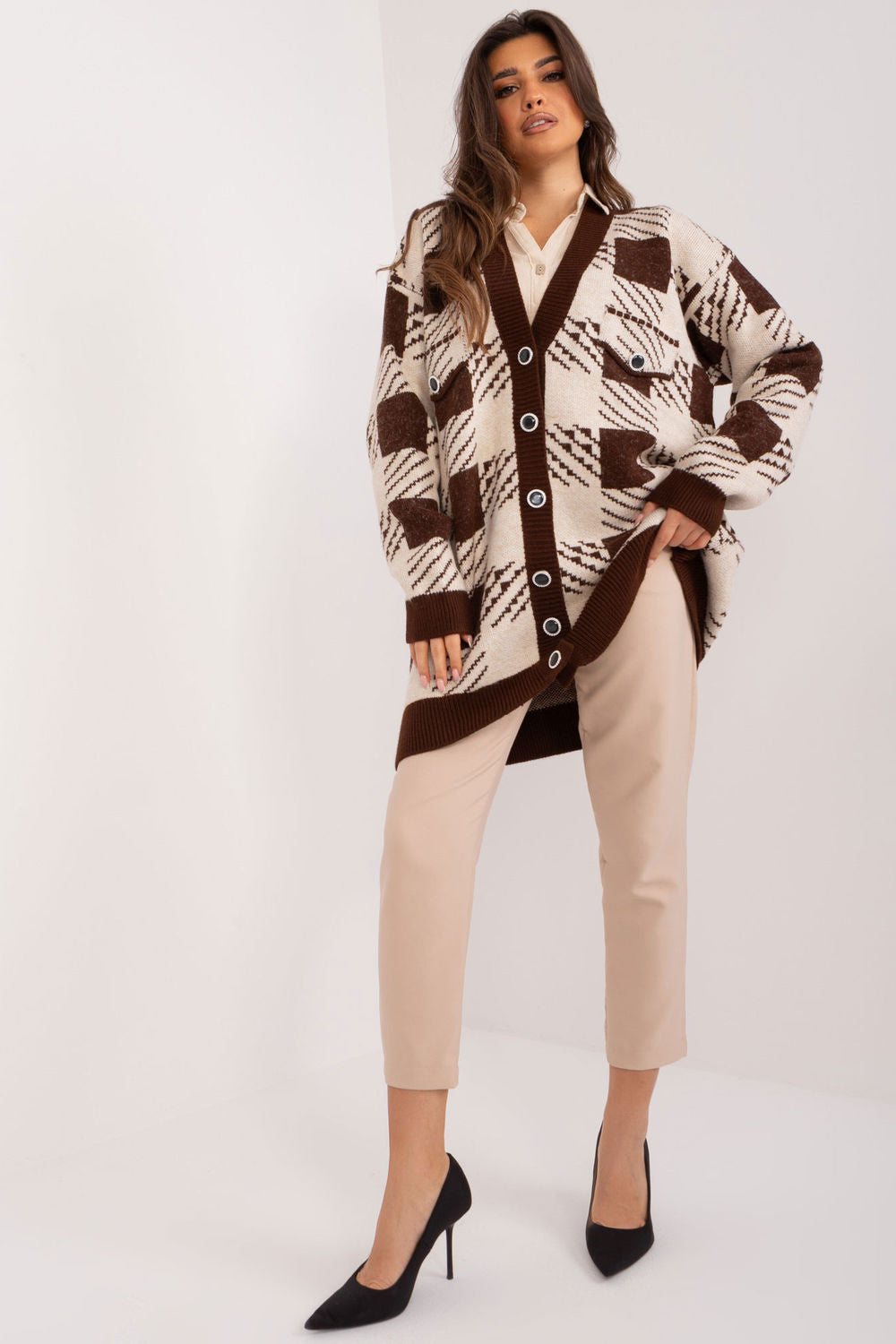 El suéter largo informal para mujer es una opción ideal para el uso diario y el trabajo. Confeccionado con una mezcla de acrílico, poliéster y elastano, es suave, elástico y cómodo de llevar. El escote en pico aporta elegancia, mientras que el cierre con botones aporta un toque clásico. El patrón geométrico realza el estilo moderno y convierte el jersey en una pieza única de armario. Las mangas largas y el corte más holgado brindan comodidad y libertad de movimiento. Perfecto para jeans, faldas o pantalones elegantes, ideal para estilismo casual y de oficina.