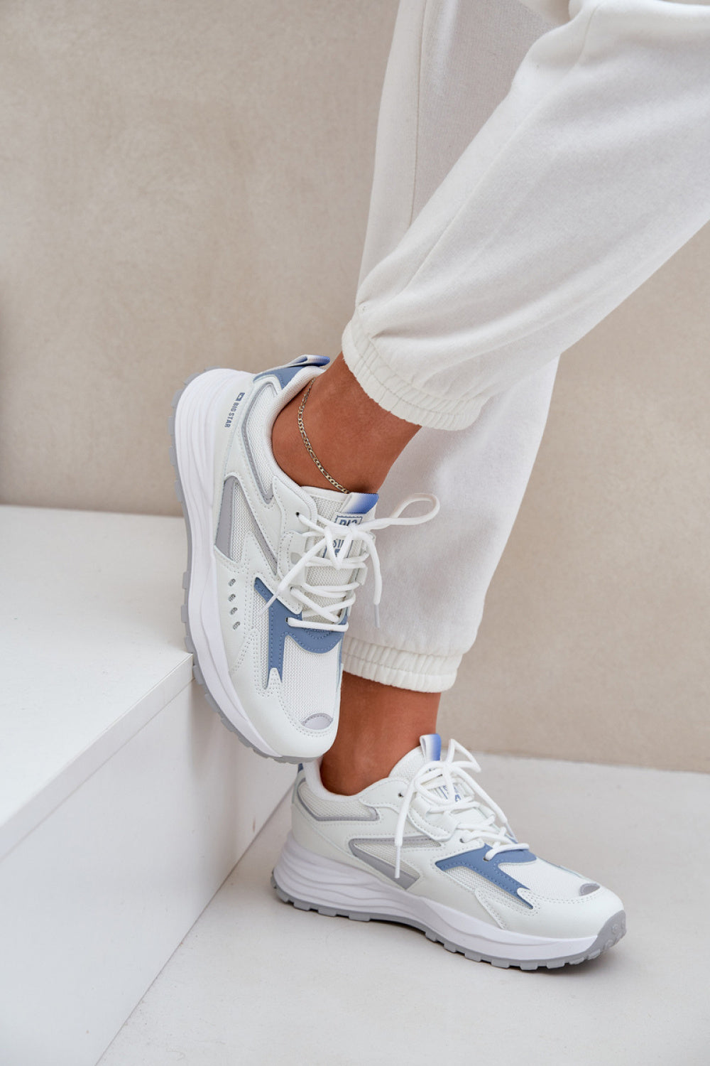 Zapatillas deportivas para mujer de la marca Big Star. Las punteras son redondeadas, lo que garantiza comodidad durante todo el día. Fabricadas en una combinación de cuero ecológico y tela, ofrecen durabilidad y ligereza. La exclusiva plantilla HI-POLLY SYSTEM, fabricada con materiales reciclados, es resistente a la abrasión y la deformación, absorbe eficazmente la humedad y amortigua los impactos, proporcionando comodidad durante actividades intensas. Este calzado combina funcionalidad con un estilo moderno.