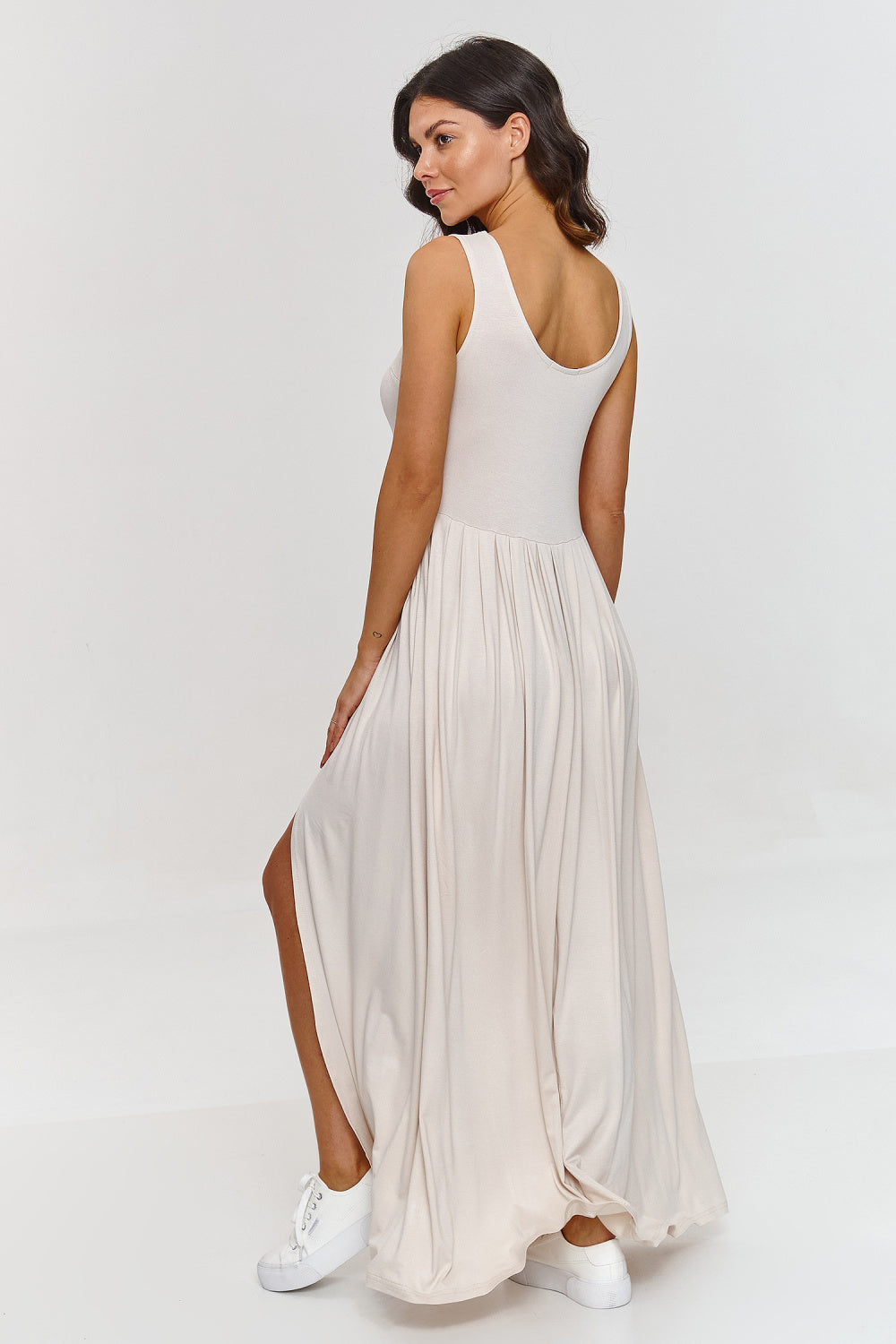 Este vestido maxi combina elegancia y comodidad, perfecto para los días de primavera y verano. Confeccionado en agradable viscosa, garantiza transpirabilidad y comodidad. El escote profundo realza la parte superior de la silueta y los tirantes anchos le confieren versatilidad y un look moderno. Su largo maxi alarga visualmente la silueta y sus delicados pliegues aportan ligereza y fluidez de movimiento, dándole un carácter dinámico y elegante. Una sutil abertura lateral aporta sensualidad y feminidad. Gracias a ella, el vestido es cómodo y permite libertad de movimiento. Un vestido maxi con abertura es sinónimo de clase y estilo, y quedará perfecto tanto en looks casuales como formales, según los accesorios que elijas.