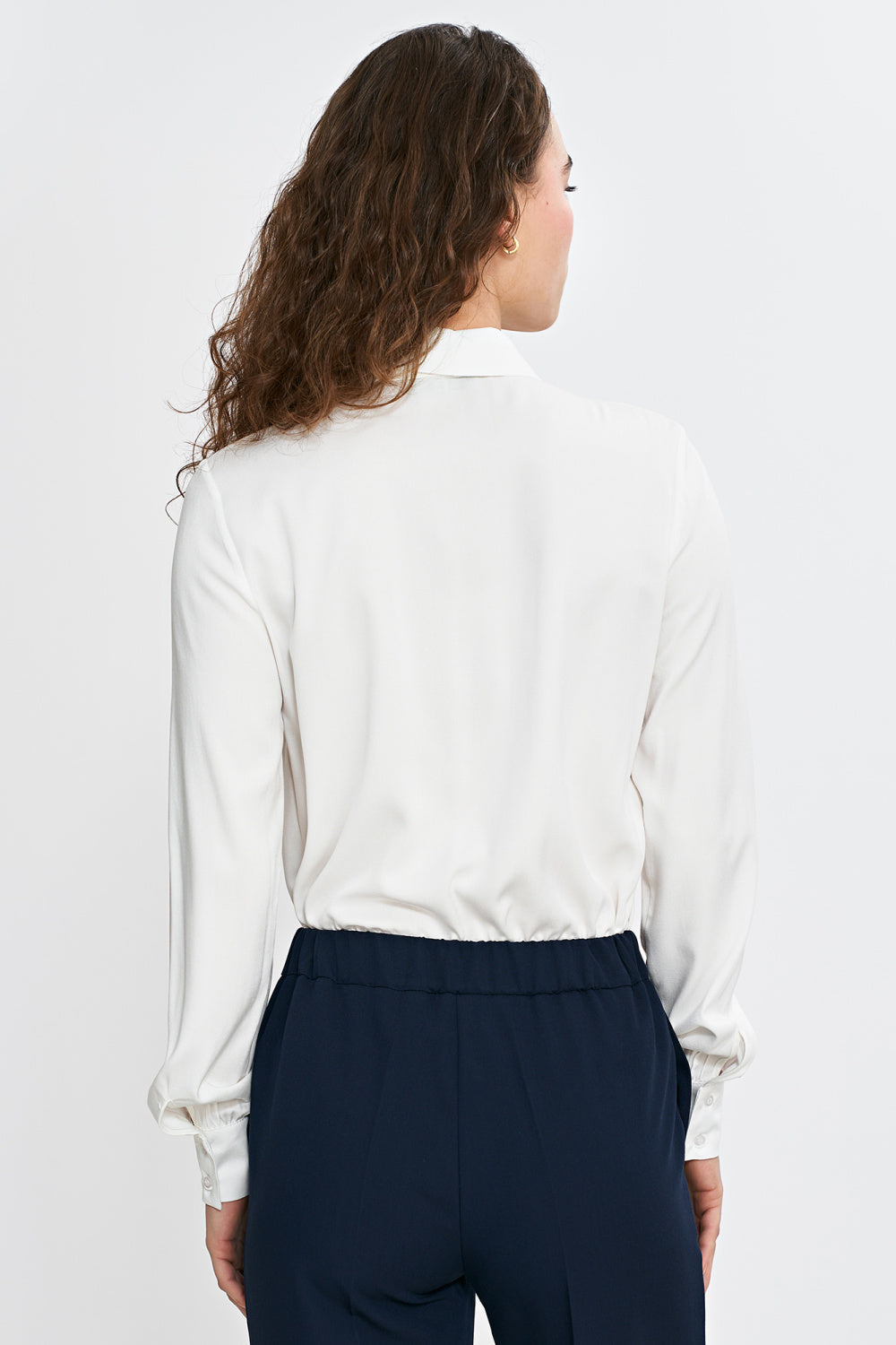 Elegante camisa de mujer de corte regular, confeccionada en viscosa ligera y agradable al tacto. El cuello clásico con un pañuelo cosido debajo le confiere un carácter sutilmente femenino y elegante. La manga larga con puño le da un toque formal. El cierre de botones en la parte delantera la hace cómoda y práctica. Ideal para la oficina, reuniones de negocios y salidas elegantes.