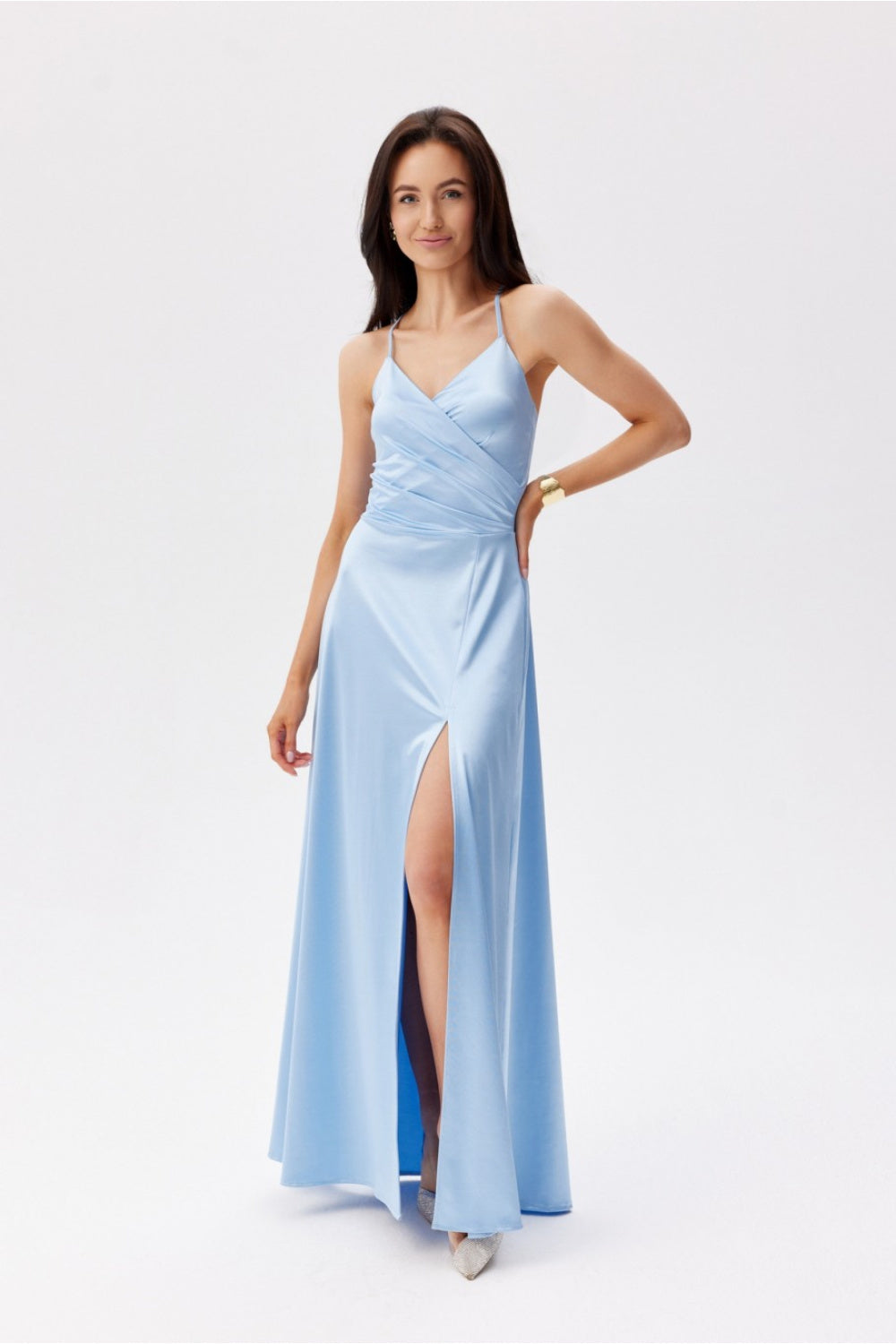 Vestido largo con tirantes finos. Parte superior cruzada y bajo ligeramente acampanado con abertura en la pierna. No lleva forro, pero tiene un cordón decorativo en la espalda que se adapta perfectamente a la silueta.