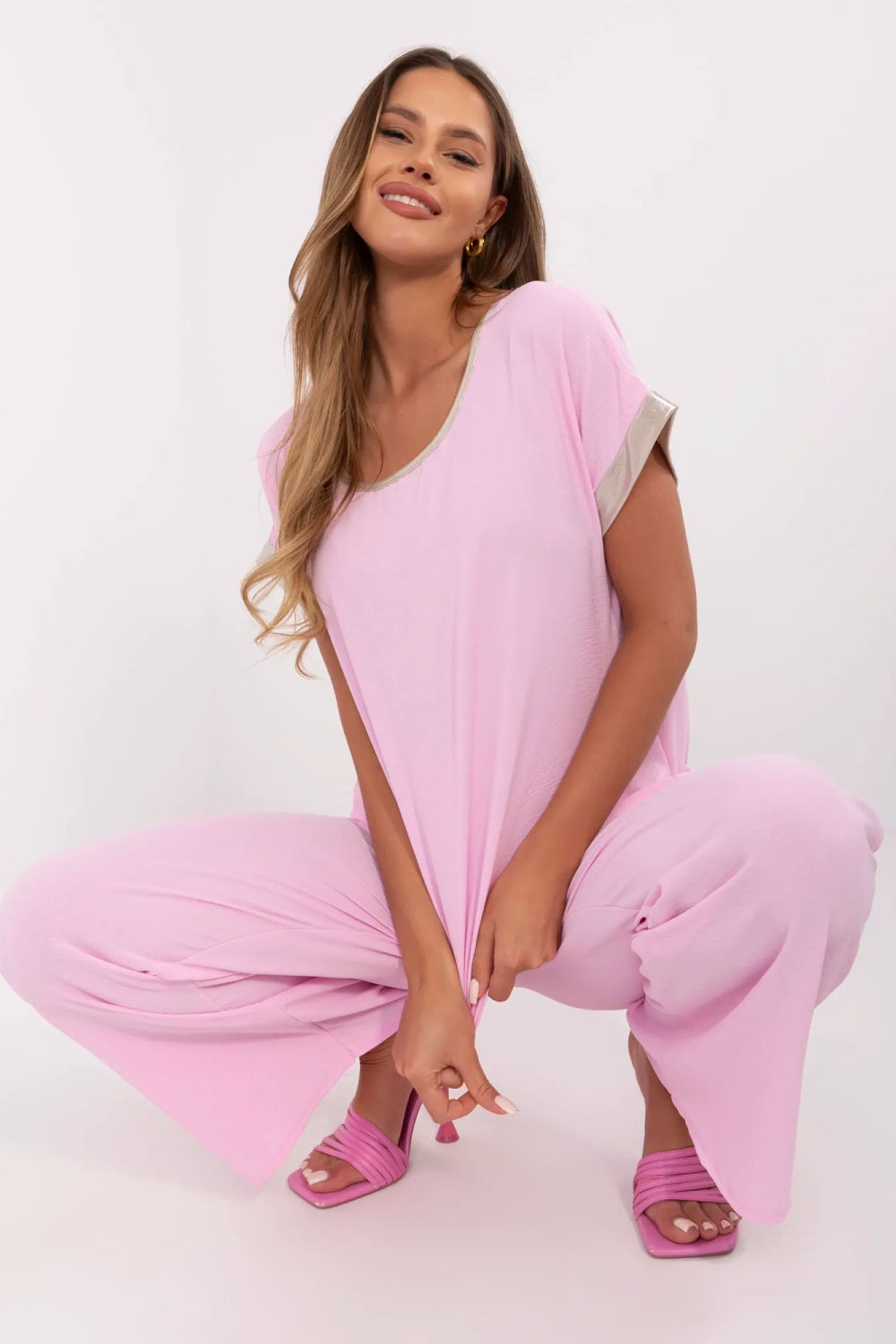 Este conjunto casual para mujer es una propuesta cómoda y elegante para el día a día, que combina lo informal con la elegancia femenina. Confeccionado en una suave y elástica mezcla de viscosa y elastano, garantiza comodidad y un ajuste perfecto. El conjunto consta de una blusa corta con cuello redondo y puños en contraste, que le aportan un toque moderno. Los pantalones anchos de talle alto con lazo a la cintura realzan la figura, y los bolsillos laterales son un práctico complemento. Su tejido suave y diseño minimalista lo hacen perfecto para looks de diario, ya sea para pasear, ir de compras o ir a una reunión informal.