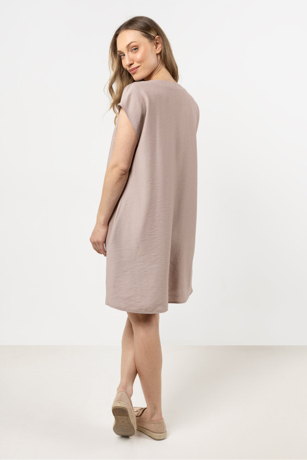Ligero y elegante, este vestido combina comodidad y estilo. Su corte holgado garantiza libertad de movimiento, mientras que el sutil fruncido en el escote le aporta un toque femenino. El cuello con lazo permite ajustar el escote, y los bolsillos laterales mejoran su funcionalidad. Fabricado en rayón, un material ligero y transpirable, es perfecto para los días cálidos.