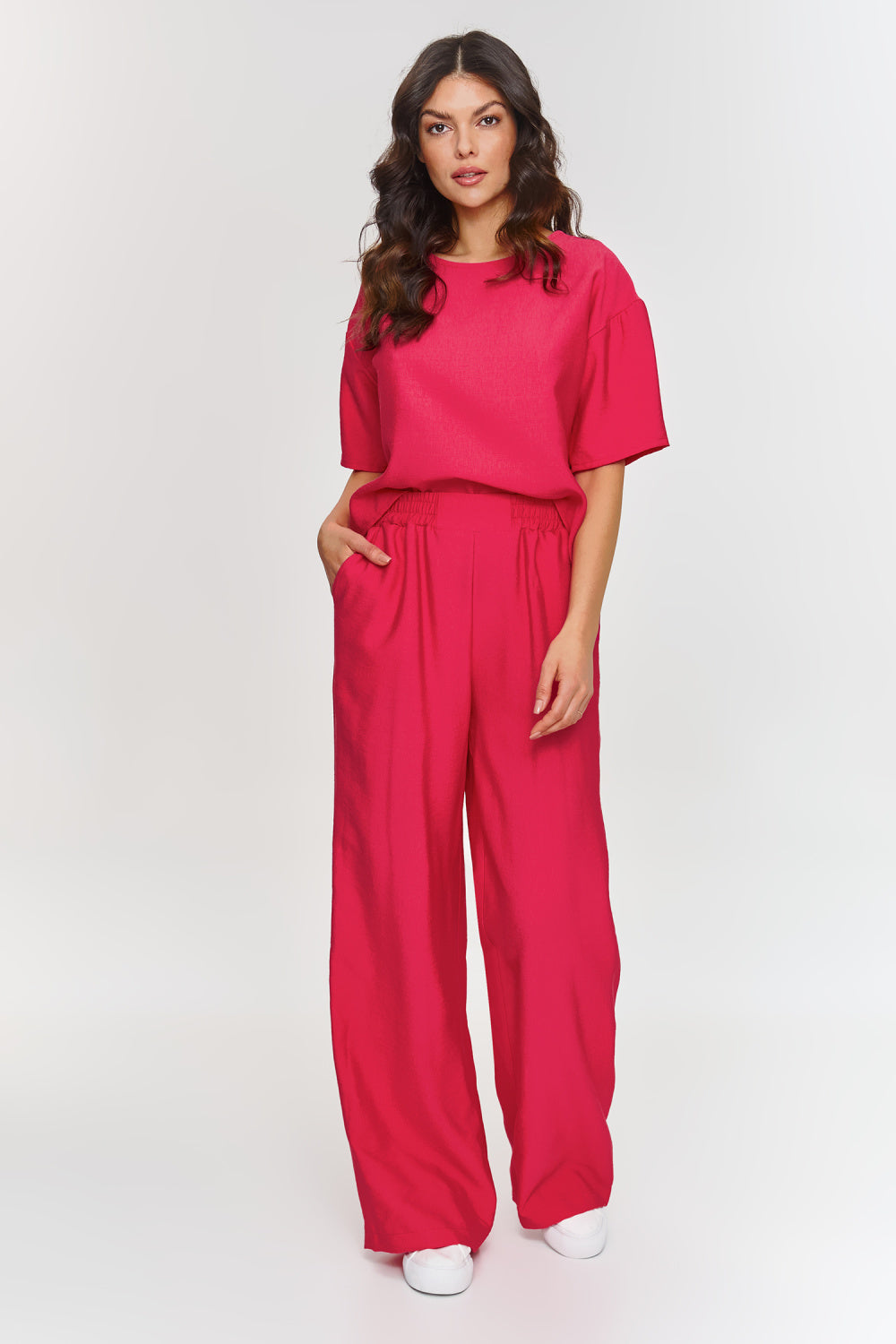 Este elegante conjunto es la elección perfecta para los días de primavera y verano, cuando buscas combinar un look moderno con alta calidad. El conjunto incluye una blusa holgada de corte cuadrado, perfecta para estilizaciones elegantes. Las mangas cortas y el corte sencillo de la blusa la convierten en una excelente opción tanto para ocasiones formales como informales, combinando elegancia y comodidad. Los pantalones anchos destacan, dándole al conjunto un aspecto moderno y elegante. La cinturilla elástica garantiza comodidad, mientras que su largo añade clase y estilo al conjunto. El modelo está confeccionado en un material delicado y ligero que imita el lino. El corte sencillo pero refinado le da al conjunto un carácter atemporal que lucirá elegante en cualquier silueta. El conjunto es perfecto para reuniones de negocios, salidas elegantes o viajes a la ciudad cuando buscas combinar elegancia y comodidad. Puedes combinarlo con tacones, sandalias elegantes o zapatillas blancas.