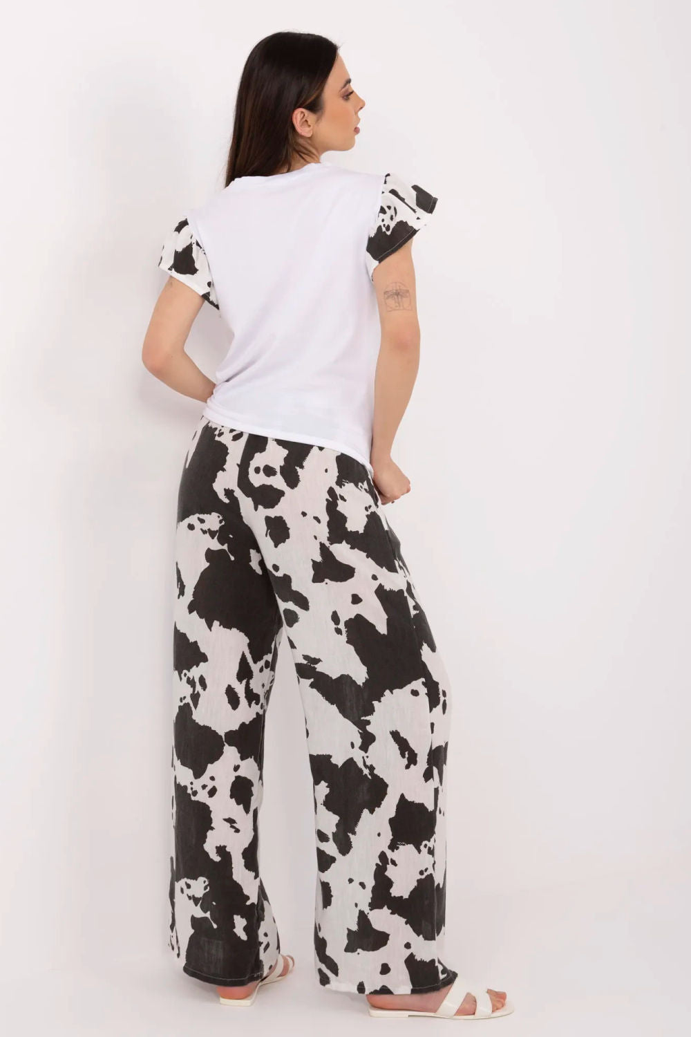 Elegante conjunto de mujer, perfecto para el día a día, que combina comodidad con un look moderno. Consta de una blusa con mangas cortas con volantes y un pantalón largo de pernera ancha que ofrece libertad de movimiento. La blusa está decorada con un sutil estampado animal y, además, cuenta con un bolsillo a la altura del pecho, un detalle práctico y elegante. Los pantalones de cintura alta, con banda elástica, se ajustan perfectamente a la silueta, ofreciendo comodidad durante todo el día. Los bolsillos laterales añaden funcionalidad y un toque moderno. Fabricado en una combinación de algodón y elastano, estos materiales garantizan comodidad, flexibilidad y durabilidad. El conjunto quedará perfecto en looks de diario, combinando un estilo casual con uno femenino.