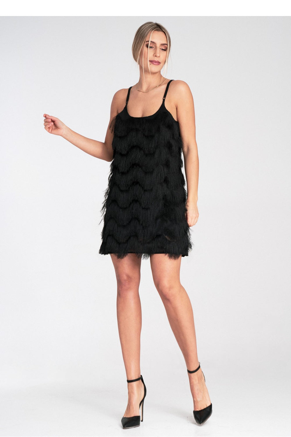 Minivestido con flecos decorativos. Tirantes finos y ajustables. Corte holgado. Vestido con forro.