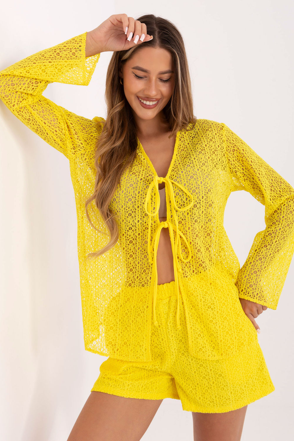 El conjunto de encaje para mujer, compuesto por camisa y shorts, es ideal para looks casuales de verano. Confeccionado en una agradable mezcla de algodón, elastano y poliéster, proporciona comodidad y libertad de movimiento. La camisa de manga larga y escote en V se cierra con una elegante corbata, aportando ligereza y un toque moderno al conjunto. Los shorts de pernera ancha y cintura alta incorporan prácticos bolsillos laterales y un cómodo forro, garantizando comodidad y discreción. El estampado de encaje le da al conjunto un sutil encanto, convirtiéndolo en una excelente opción para los días cálidos, tanto para pasear como para quedar con amigos.