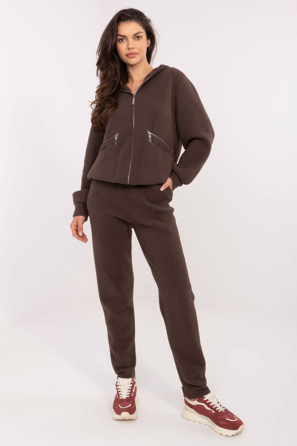 Este conjunto casual para mujer es ideal para los días más frescos. Elegante, cómodo y agradablemente envolvente. Confeccionado en una mezcla de lana, viscosa, angora y poliéster de alta calidad, ofrece excelente confort térmico, suavidad y durabilidad. La sudadera con capucha y cremallera cuenta con una práctica capucha, mangas largas y amplios bolsillos de parche en la parte delantera, lo que le aporta carácter y funcionalidad. Su diseño sencillo y suave la hace perfecta para combinar con diversos accesorios y es perfecta tanto para estar en casa como para pasear. Los pantalones, de pernera larga y ajustada, tienen cintura alta y un lazo en la cintura, lo que se adapta perfectamente a la silueta. Los bolsillos laterales insertados aportan practicidad sin alterar su forma minimalista. Este conjunto es perfecto para el día a día, combinando libertad de movimiento, calidez y un look moderno en un solo conjunto.