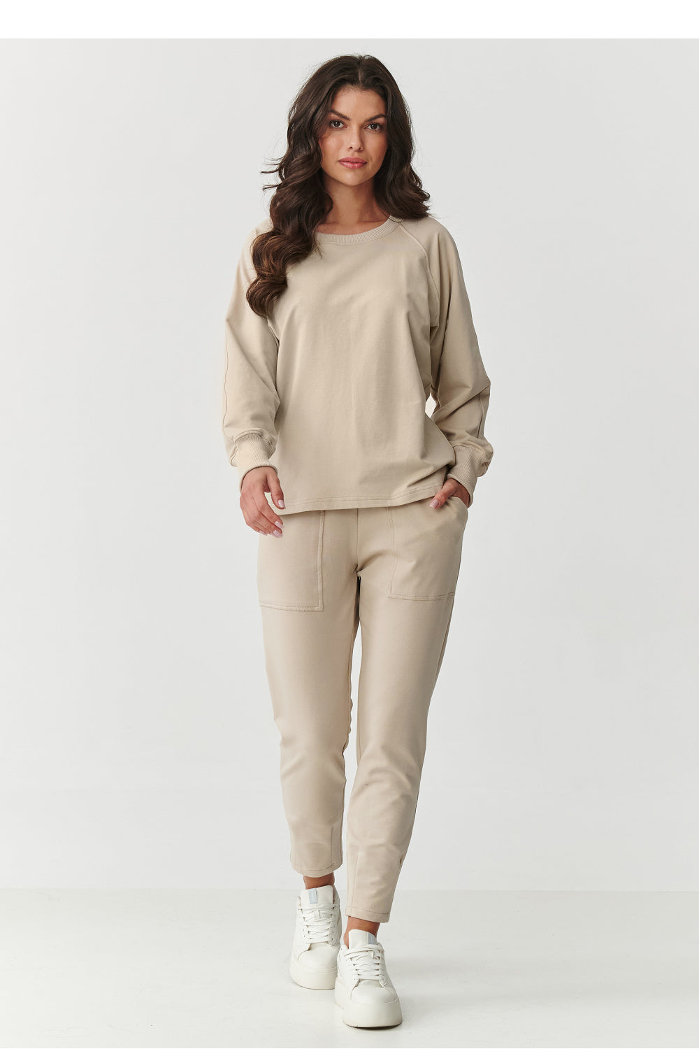 Este cómodo y elegante conjunto deportivo para mujer es la elección perfecta para quienes valoran la comodidad sin renunciar a un look moderno. Fabricado con materiales de alta calidad, la combinación de algodón y elastano garantiza suavidad, flexibilidad y durabilidad, lo que lo hace perfecto para usar en casa, de paseo, de compras o en el trabajo. La sudadera tiene un corte holgado clásico con mangas largas rematadas con ribete, lo que le aporta un toque deportivo. El cuello redondo realza su versatilidad. Los pantalones clásicos son cómodos gracias a su corte holgado y están equipados con prácticos bolsillos grandes, que no solo lucen geniales, sino que también son extremadamente funcionales. Además, las costuras en la parte inferior de las piernas crean un ligero efecto de ajuste hacia abajo. El chándal no hace bolitas, resiste bien los lavados y mantiene su forma, por lo que te servirá durante muchas temporadas.