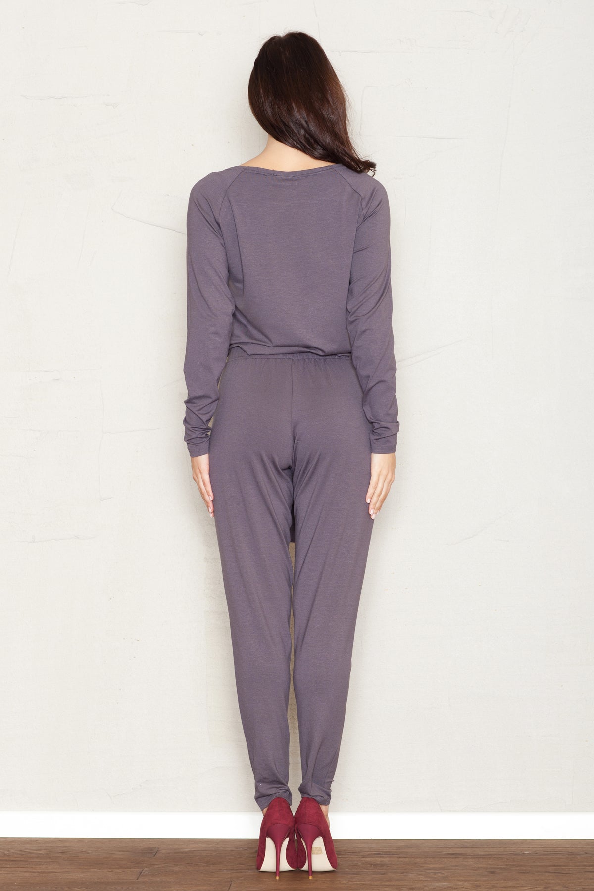 Mono moderno y extremadamente femenino confeccionado en suave viscosa con elastano. La parte de abajo es un pantalón largo con bolsillos. Las piernas son cónicas, con una banda elástica en la cintura y un divertido lazo. El top es una blusa más holgada, de manga larga y escote de media caña. El conjunto es una gran solución tanto para un paseo como para un fin de semana fuera de la ciudad.