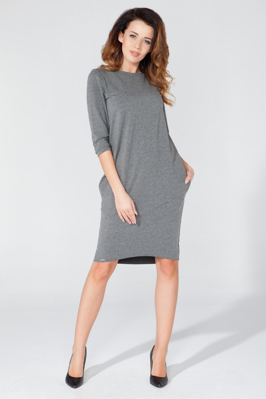 Elegante vestido de punto con bolsillos en las caderas. Corte tuba. Mangas y escote rematados con ribete. Bajo sin rematar. Mangas 3/4.