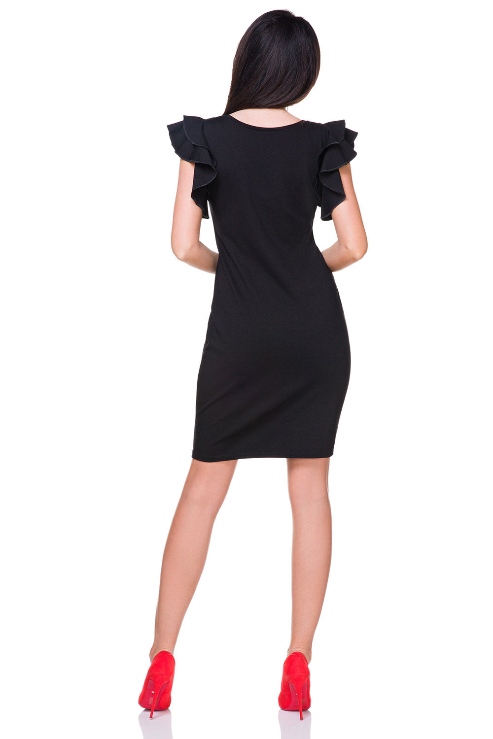 Vestido de punto. Cuello rematado con ribete. En lugar de la manga tradicional, luce un volante impresionante.